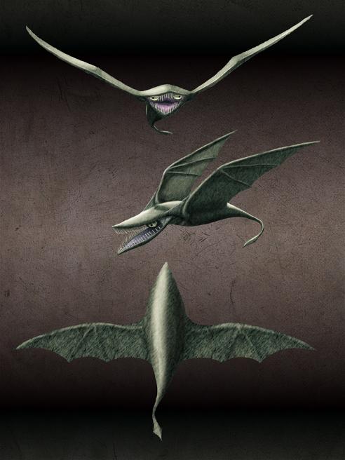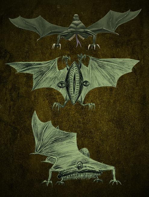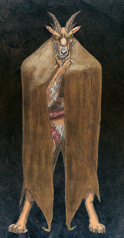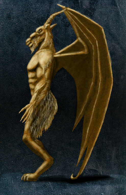 Covered in white, goatish hair, green leathery wings, and naked...