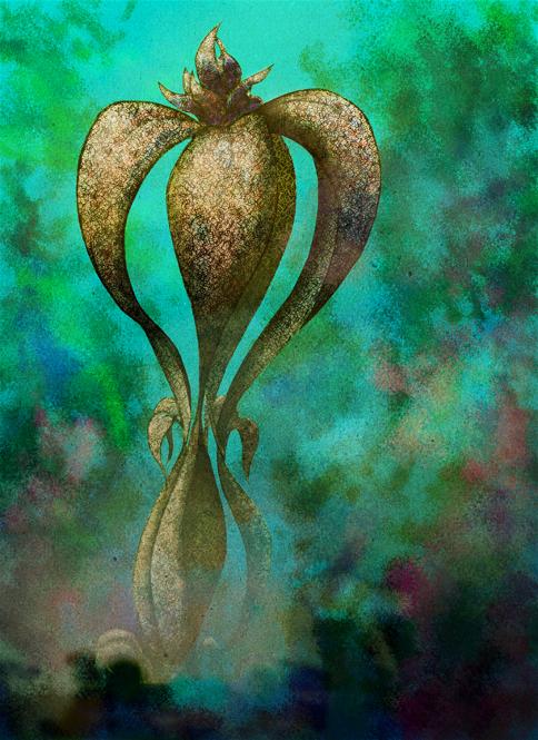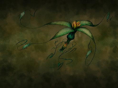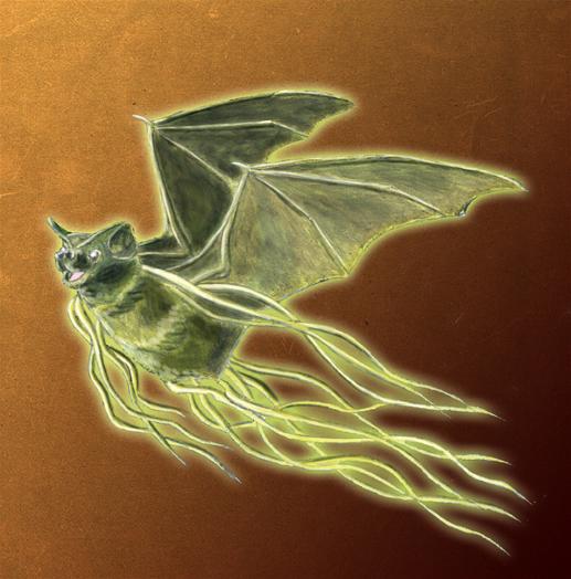 His sidekick, FLAXO. " A little furry glowing bat with jellyfish arms and a backward human face floating around."